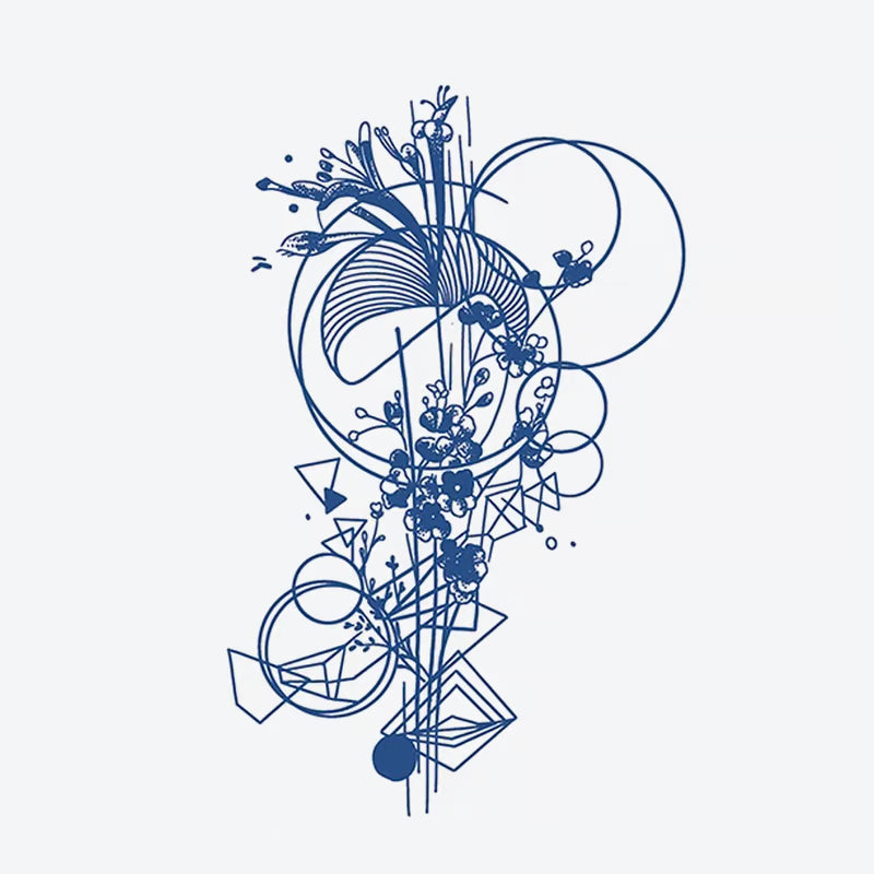 Experience elegance with this Floral Geometric Design temporary tattoo. Waterproof, realistic, and made with vegan ink, it adds a stylish touch to any look.