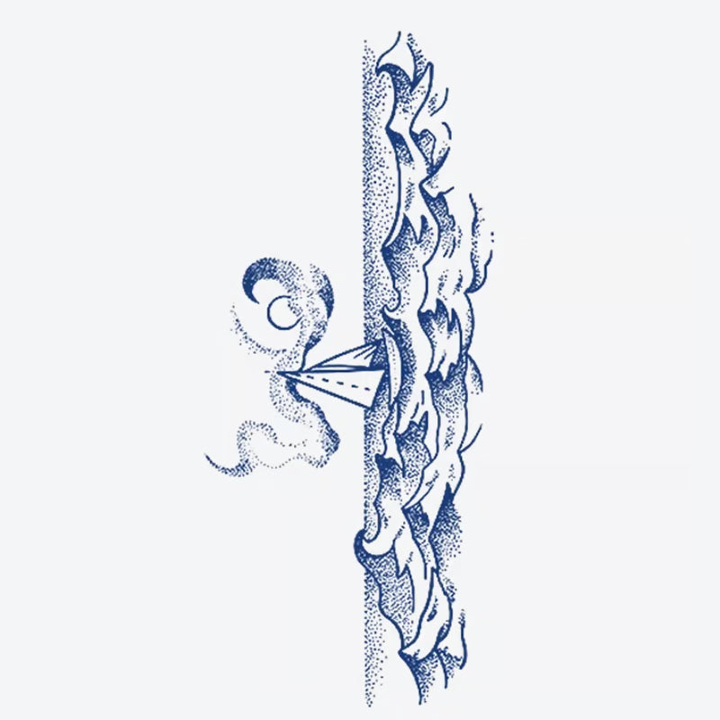 Whimsical paper airplane tattoo in blue features intricate details, designed with waterproof and long-lasting vegan ink for a realistic look. Perfect for playful expression!