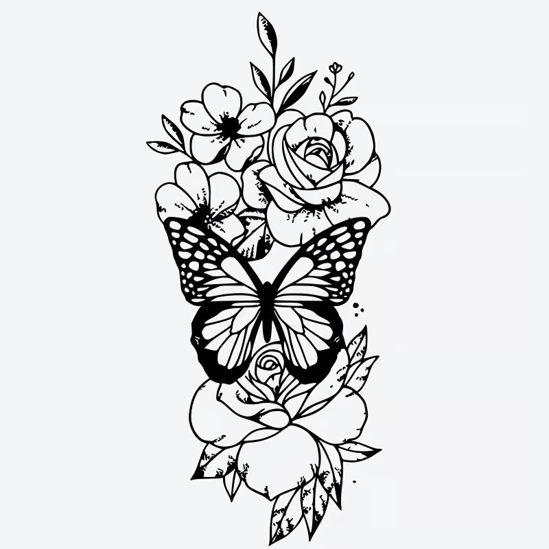 Embrace nature's beauty with this Butterfly Floral Arrangement temporary tattoo. It's realistic, waterproof, long-lasting, and made with vegan ink for stylish expression.