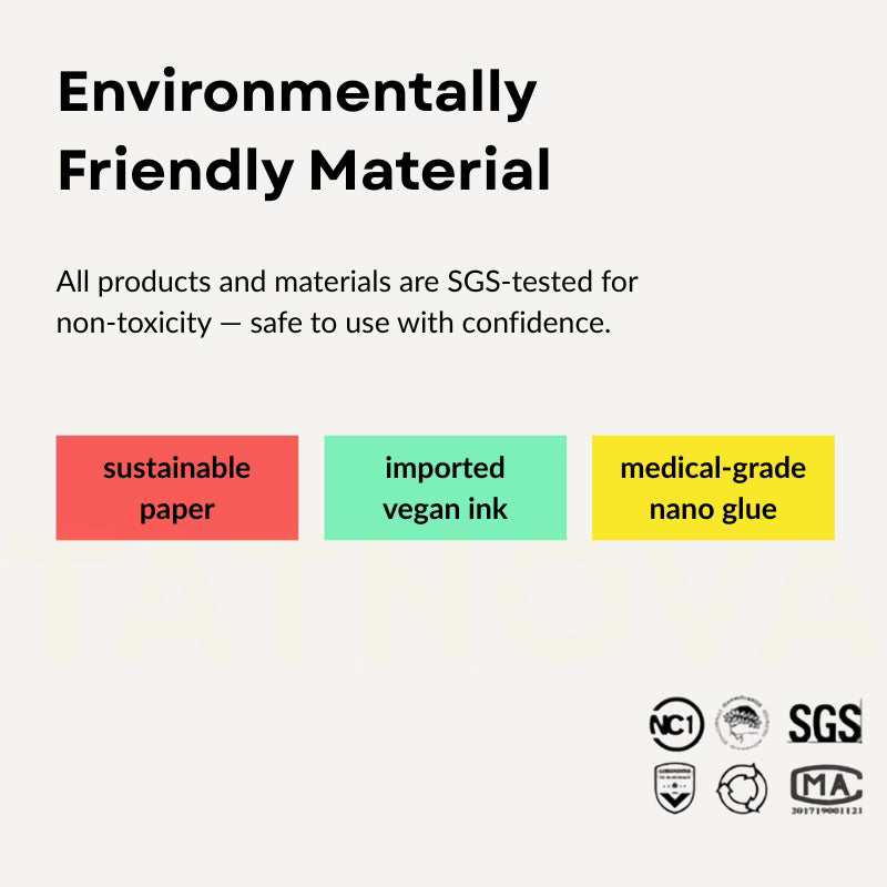 If you want instant impact, our temporary tattoos are ready the moment you put them on—style in seconds. We use only dyes that comply with EU REACH and FDA safety standards, ensuring they are safe for human use — skin-friendly, non-toxic, and worry-free.