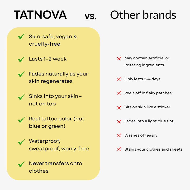 I love how Tatnova tattoos let me express myself without commitment. I can switch up my look every week. Plus, the designs are chic and trendy.