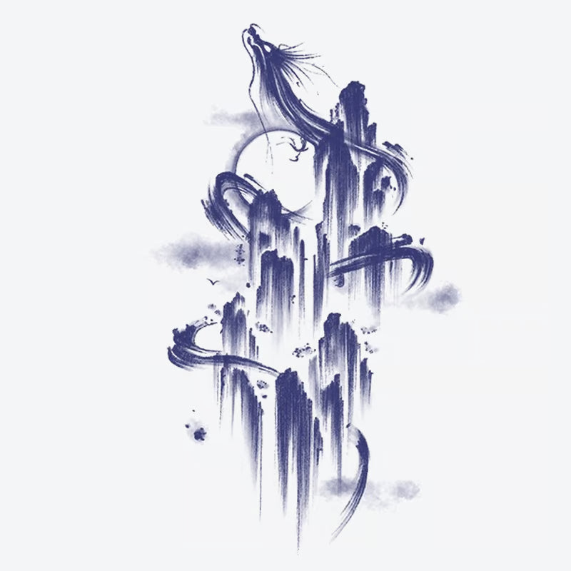 This stunning Dragon Mountain watercolor tattoo features elegant artistry, capturing mythical beauty and nature's essence. It's a realistic, long-lasting temporary tattoo made with vegan ink.