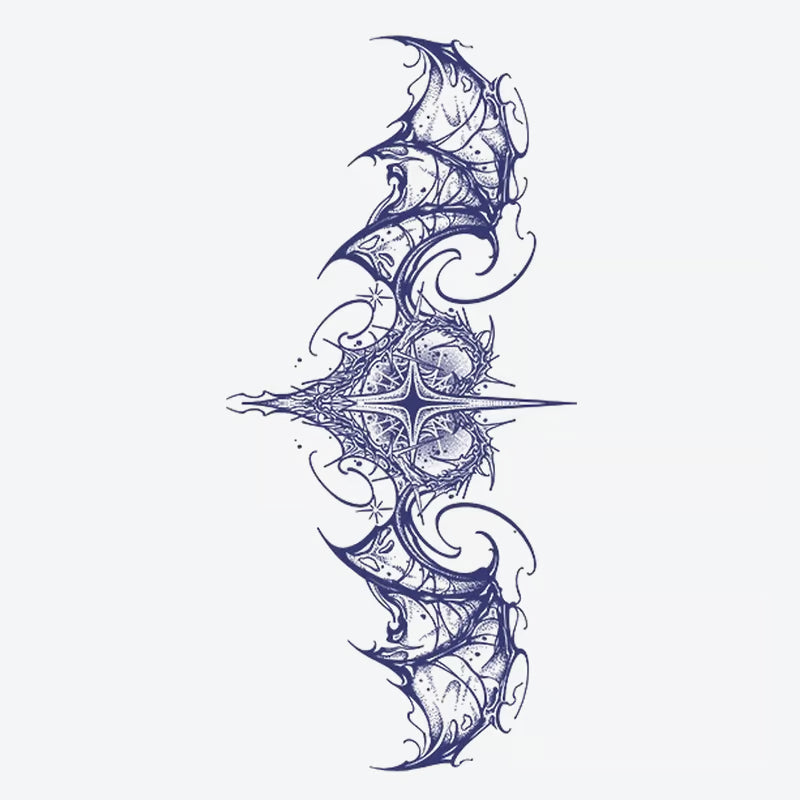 Embrace a gothic elegance with the Bat Heart Crown Tattoo. This intricate, minimalist design features detailed wings and a heart, made with waterproof, vegan ink for lasting impact.