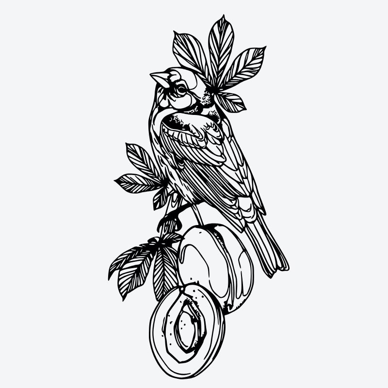 Embrace nature with this Bird and Fruit temporary tattoo. Its detailed, realistic design features vibrant colors, is waterproof, and made with vegan ink for long-lasting style.