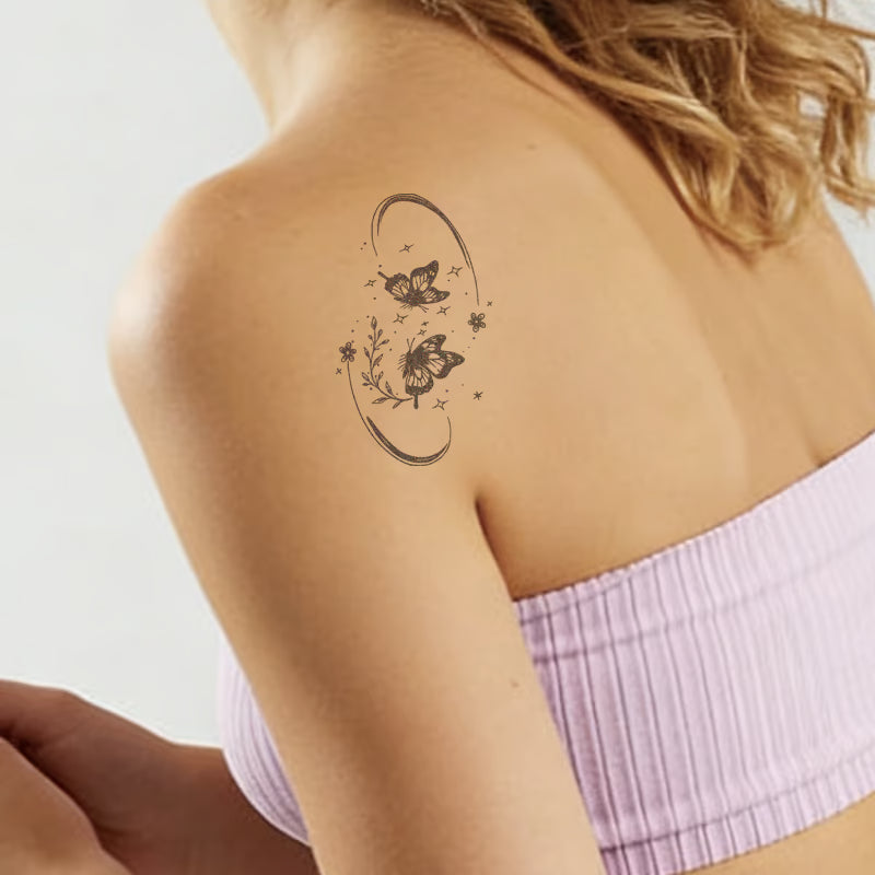 Embrace nature's beauty with this butterfly floral sparkle temporary tattoo. Featuring a minimalist design, it's waterproof, long-lasting, and crafted with vegan ink.