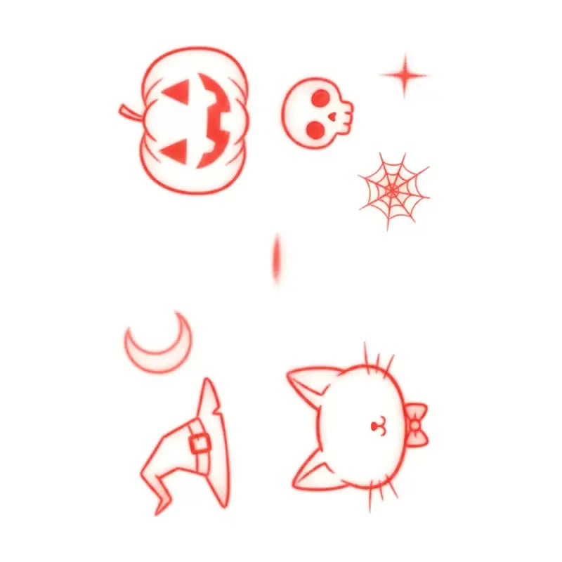 Get into the Halloween spirit with this fun temporary tattoo featuring playful pumpkins, skulls, and a cute cat. Waterproof, long-lasting, and made with vegan ink!