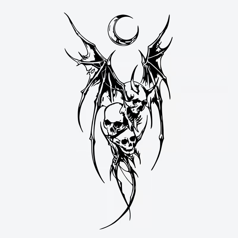 Embrace the dark allure with this Skull Bat Crescent temporary tattoo. Featuring striking skulls and wings, it's a minimalist, realistic design made with vegan ink.