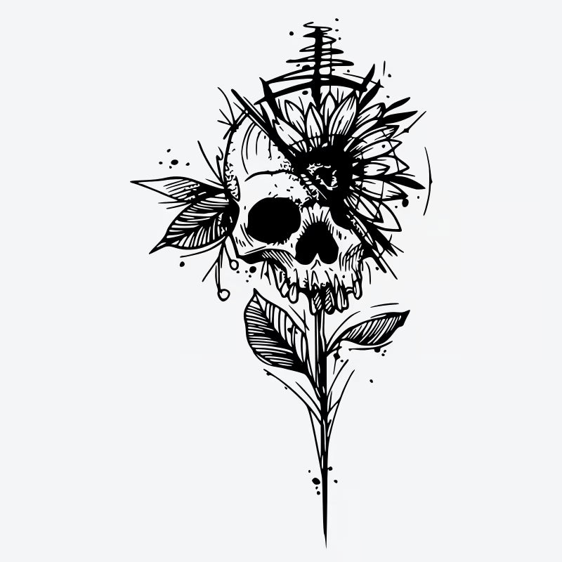 Embrace the edgy beauty of the Skull Sunflower Floral Tattoo. This temporary tattoo features a stunning, realistic design that's waterproof, long-lasting, and crafted with vegan ink.