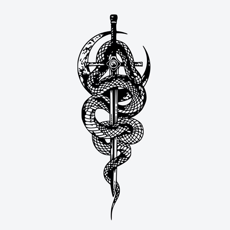 Embrace the allure of the 'Sword Snake Crescent Moon Tattoo.' This temporary tattoo features a striking design with a sword, snake, and crescent moon, crafted with waterproof, realistic vegan ink for long-lasting style.