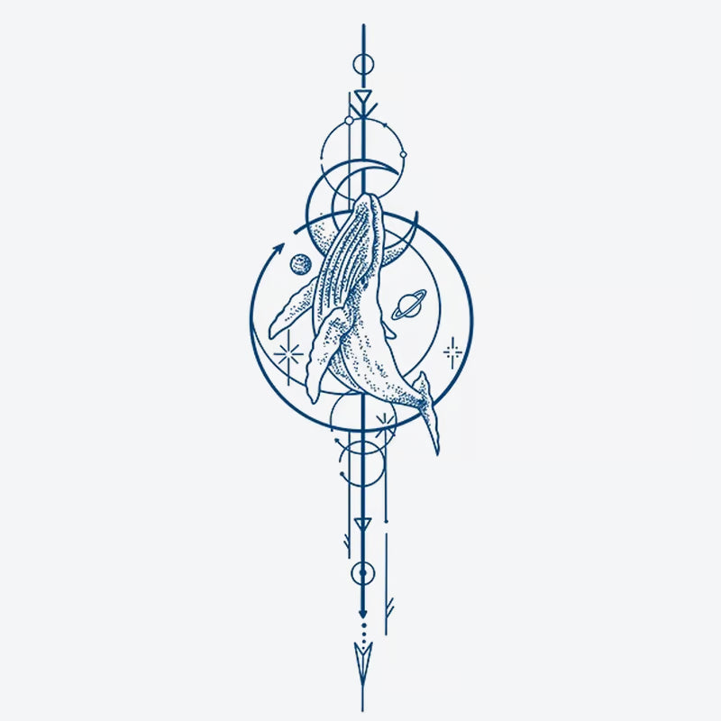 Dive into the cosmic depths with this whale cosmic mandala tattoo, featuring minimalist details and a mystical vibe. It's a long-lasting, waterproof temporary tattoo crafted with vegan ink.